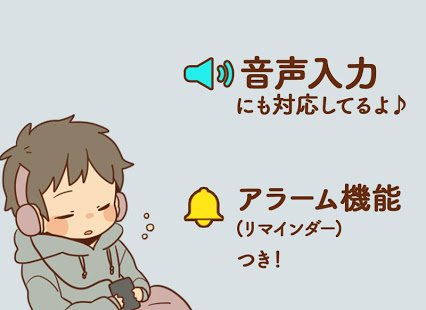 音声入力、文字サイズ変更、アラーム(リマインダー)にも対応しています。