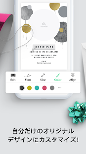 言わば、私たちは皆さんのグラフィックデザイナーやアーティストです。自分だけの好きなデザインを作成するのは、簡単なことではありません。正直なところ、複雑なソフトウェアの使い方やデザイン理論を覚えて、初めてできる職人技です。この招待状&インビテーションカード作成アプリは直感的な使い方で簡単に数多のテンプレートを加工し、一味違ったプロフェッショナルな仕上がりにデザインしてくれます。招待状を見てくれる人たちがあっと驚くようなものが簡単に作成できるよう、様々な機能が搭載されています。美しいタイポグラフィー、色やフォントのカスタマイズ、お気に入りの写真をアップロードしてカード用に素敵にワンタッチで加工しましょう!