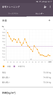 カレンダーはあなたのワークアウトの進捗状況をログに記録しますので、あなたは意欲を維持します。 また、ウェイトチャート上であなたのウェイト傾向を見ることができます。