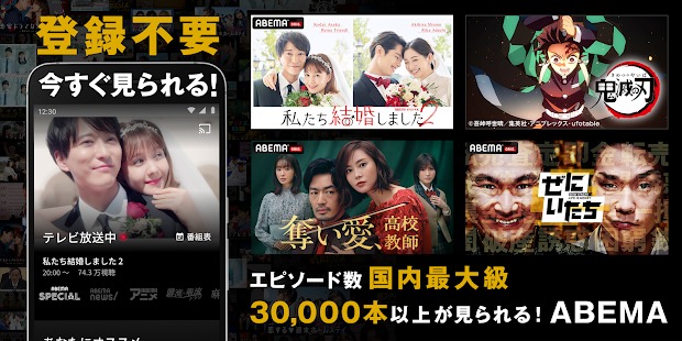 「ABEMA」はテレビのイノベーションを目指し“新しい未来のテレビ”として展開する動画配信事業。登録は不要で、国内唯一の24時間編成のニュース専門チャンネルをはじめ、オリジナルのドラマや恋愛番組、アニメ、スポーツなど、多彩なジャンルの約20チャンネルを24時間365日放送しています。