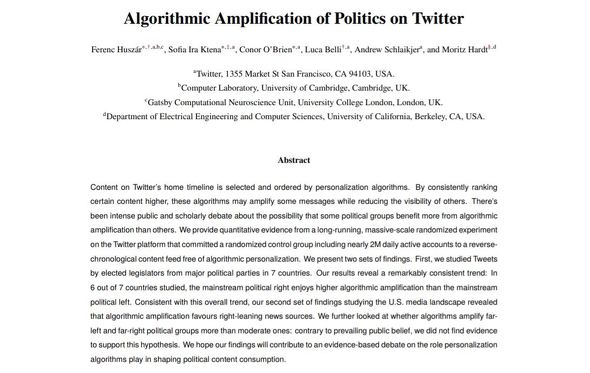 Twitterは、サービスの推奨アルゴリズムが政治的に右寄りのコンテンツを増幅する傾向があるという独自の調査結果を明らかにした。 この調査では、アルゴリズムが実際にユーザーのタイムラインに多くの注意を払っているかどうかは調べていない。 ただし、調査対象の7か国のうち6か国は、全体として政治的に重要なコンテンツを増幅している。
